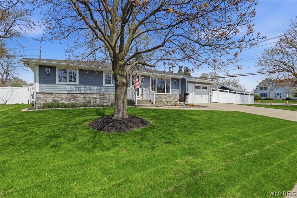 Exceptionally well-maintained home set on a desirable corner lot in the Depew School District offering an open-concept layout with soaring vaulted ceilings that create a bright and spacious main living area ideal for both everyday living and entertaining. The kitchen flows seamlessly into the living space and features brand new stainless steel refrigerator and dishwasher (both 2026) along with freshly painted ceilings in the kitchen, living room, and bathroom. The oversized primary bedroom provides a comfortable and private retreat. Step outside to a massive fully fenced backyard with vinyl privacy fence, two spacious sheds, and a beautiful stamped concrete patio complete with built-in fire pit - perfect for BBQs, relaxing evenings, or family gatherings. The fully finished basement is an entertainer's dream with a custom bar, two bonus rooms ideal for a home gym, office, or extra bedrooms, a full bathroom, and the perfect space to enjoy sports games with friends and family. Additional updates include a new 50-gallon hot water tank (2026), central A/C (2023), smart thermostat, a newly resurfaced epoxy garage floor with transferable lifetime warranty, and the home is pre-wired for a generator. This move-in ready home is conveniently located just minutes from major thruways, Stiglmeier Park, shopping, and dining. Pride of ownership shows throughout. Open Houses: Wednesday 4/29 5-7 PM and Saturday 5/2 11 AM-1 PM. All offers due Monday 5/4 at 2 PM.